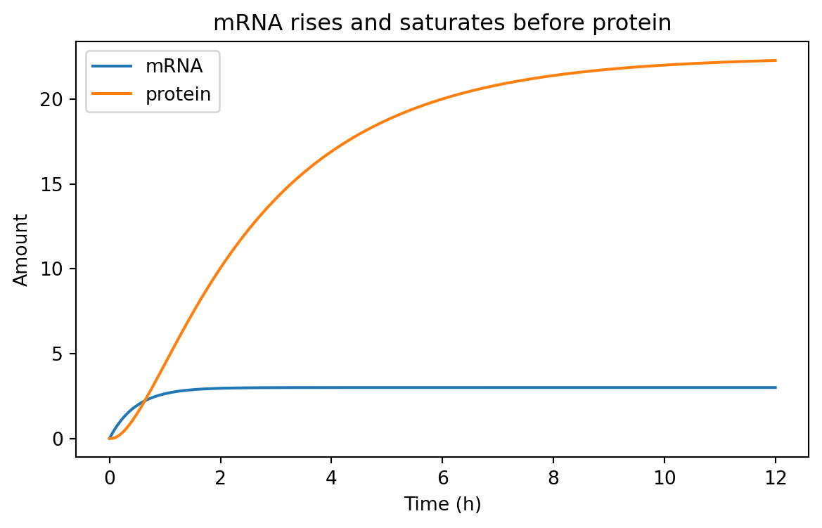 Modify the two-stage model so that the initial mRNA amount is nonzero. How does that change early protein accumulation?