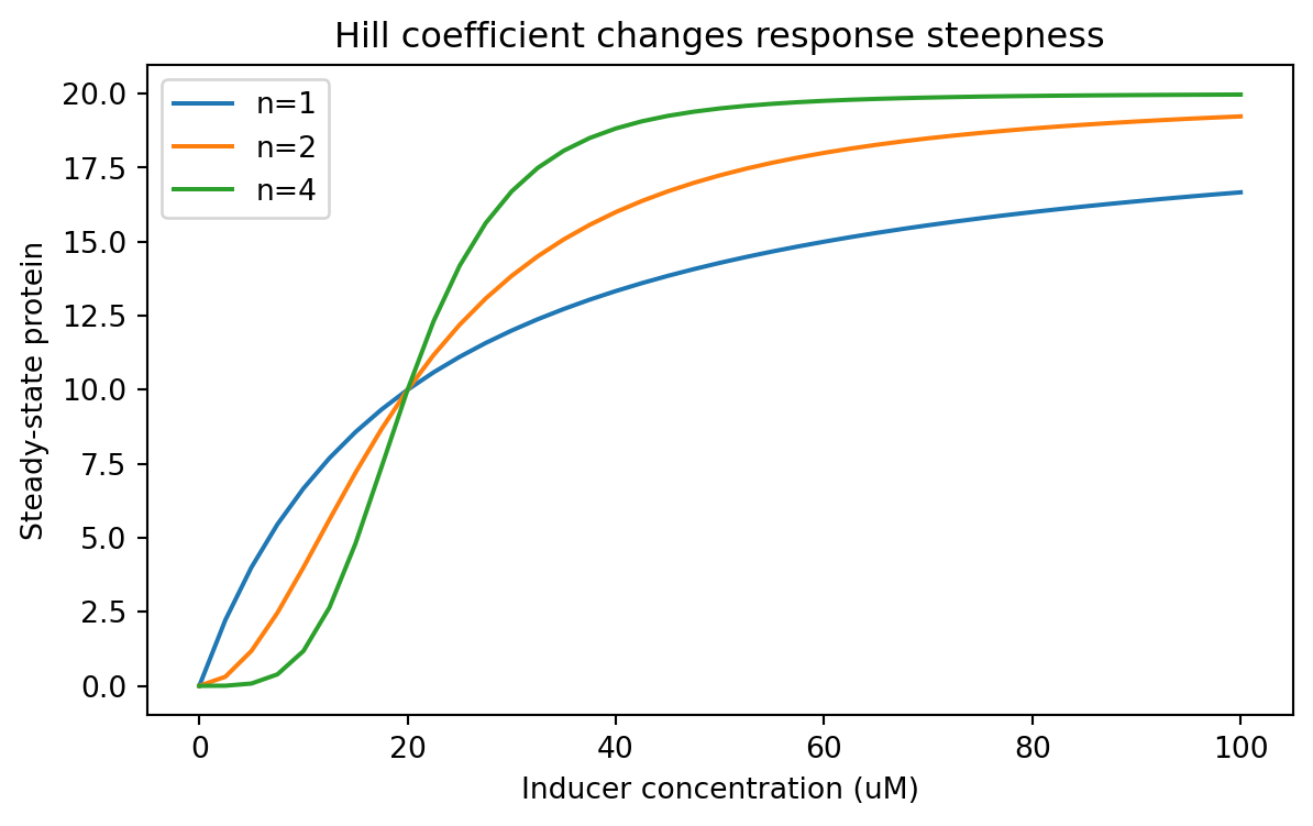 Repeat the Hill-function sweep with different values of K. How does K shift the response curve?
