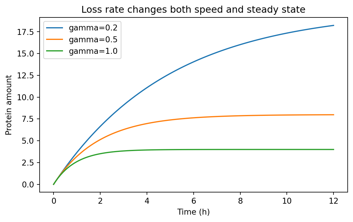 Change the degradation rate gamma in the one-variable model and measure how long it takes to reach 90% of steady state.